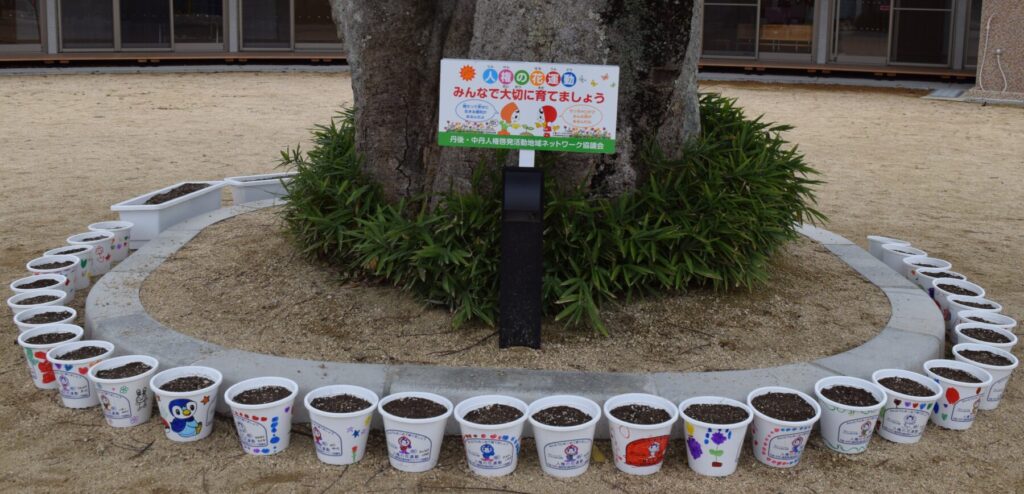 球根を植えた鉢は、園庭の榎の周りに並べました。