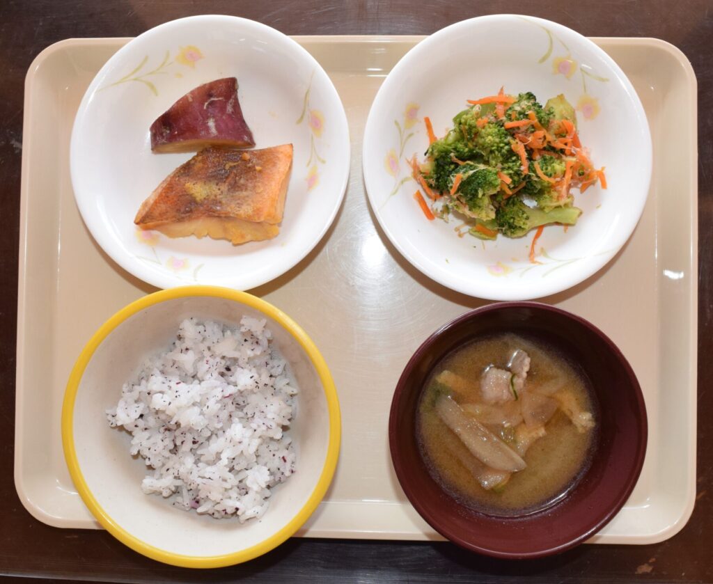 ゆかりご飯(23日は栗ご飯)・赤魚西京焼き・さつま芋煮・ブロッコリーおかか和え・豚汁