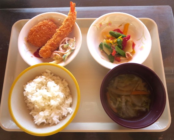 ご飯・エビフライ・コロッケ・マカロニサラダ・ベーコンと野菜ソテー・コンソメスープ