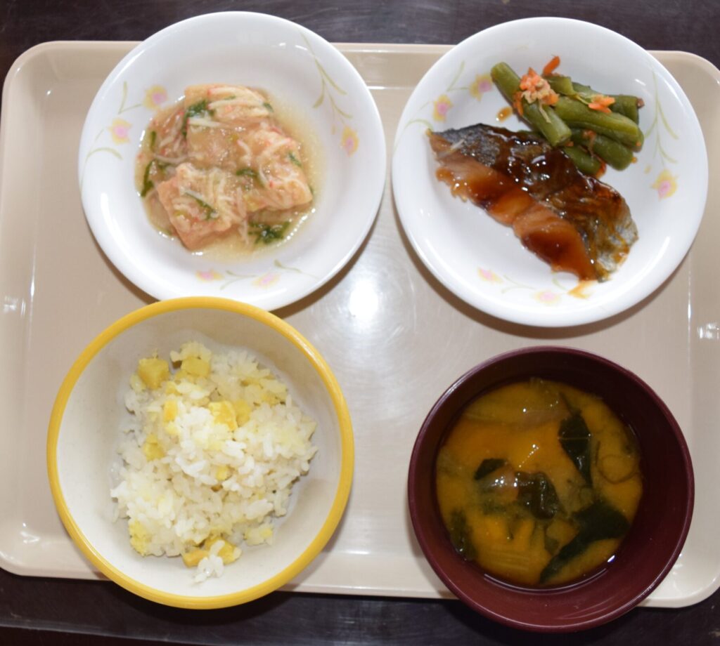 さつま芋ごはん・魚照り焼き・いんげんおかか和え・厚揚げかにあんかけ・味噌汁