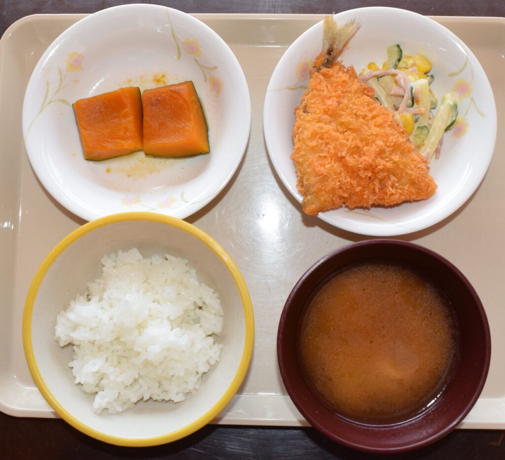 米飯・鰺フライ・マカロニサラダ・南瓜甘煮・味噌汁