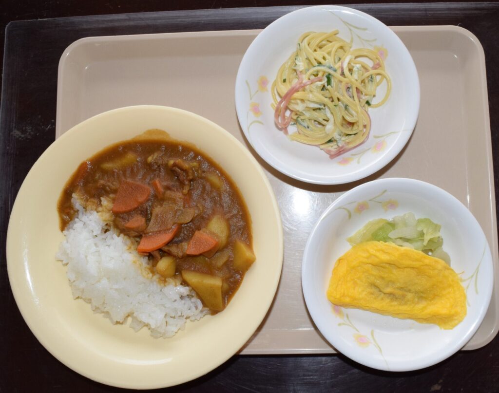 米飯・ビーフカレー・オムレツ・スパゲティ―サラダ