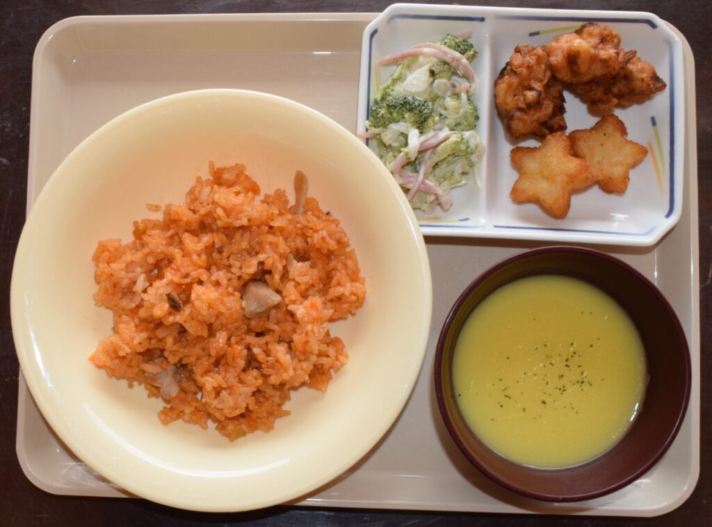 チキンライス・鶏肉唐揚げ・フライドポテト・ブロッコリーサラダ・コーンポタージュ