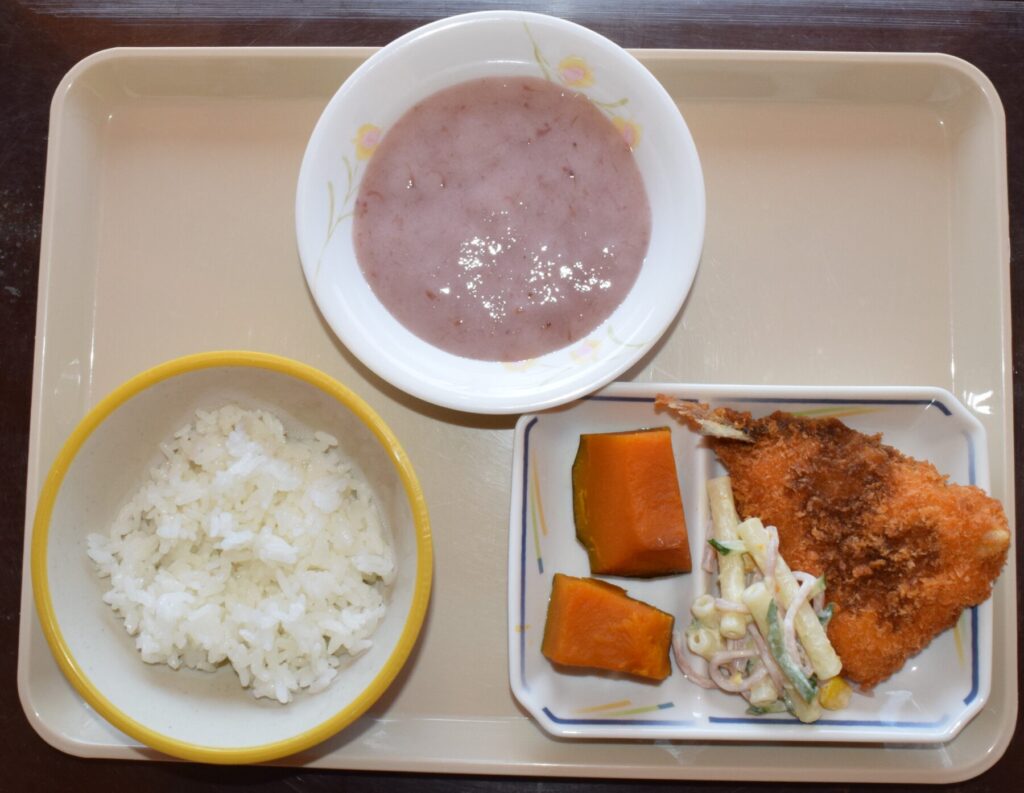 米飯・アジフライ・マカロニサラダ・南瓜甘煮・フルーチェ
