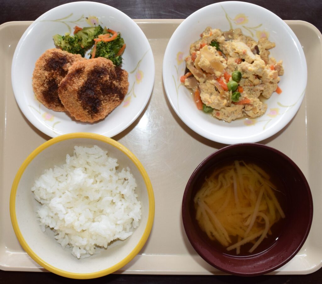 米飯・とんかつ・ブロッコリーおかか和え・炒り豆腐・味噌汁