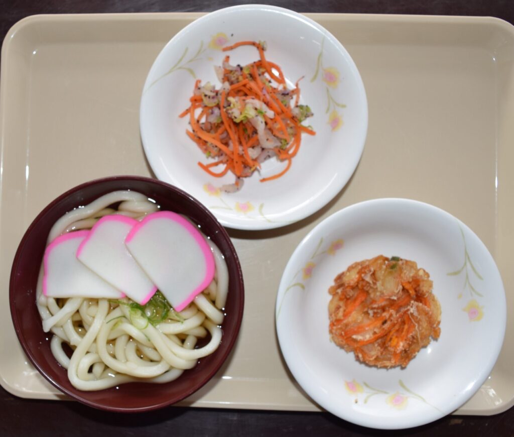 うどん・野菜のかき揚げ・白菜ゆかり和え