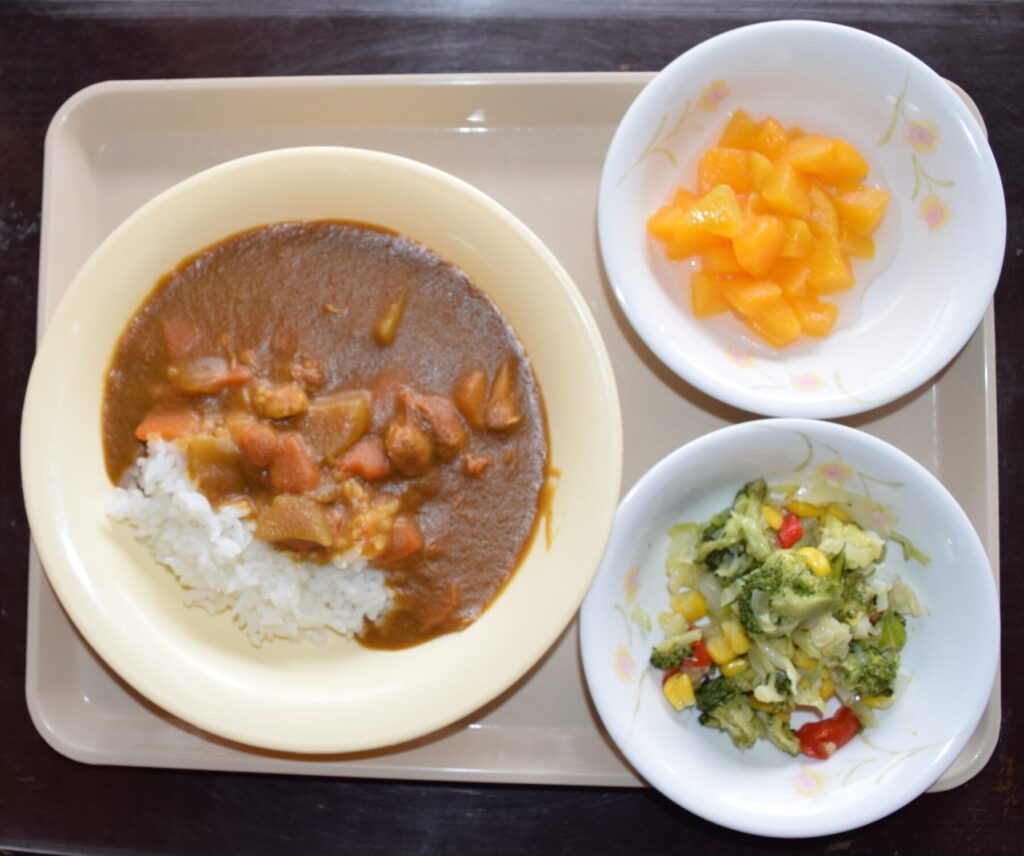 米飯・チキンカレー・カラフルサラダ・果物缶(黄桃)