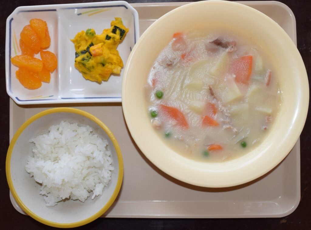 米飯・クリームシチュー・南瓜サラダ・果物缶(みかん)