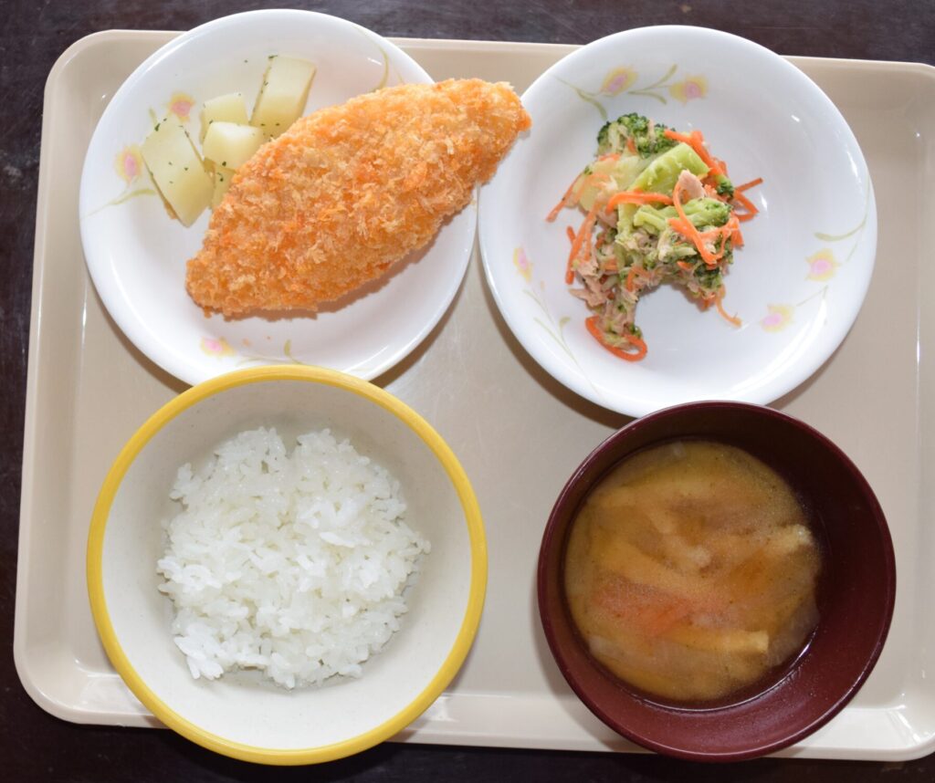 米飯・白身魚フライ・粉ふき芋・ブロッコリーとツナの和え物・味噌汁