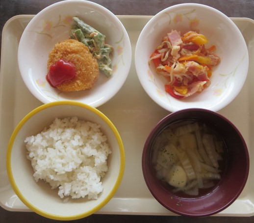 米飯・チキンカツ・いんげんマヨ和え・ベーコンと野菜ソテー・コンソメスープ