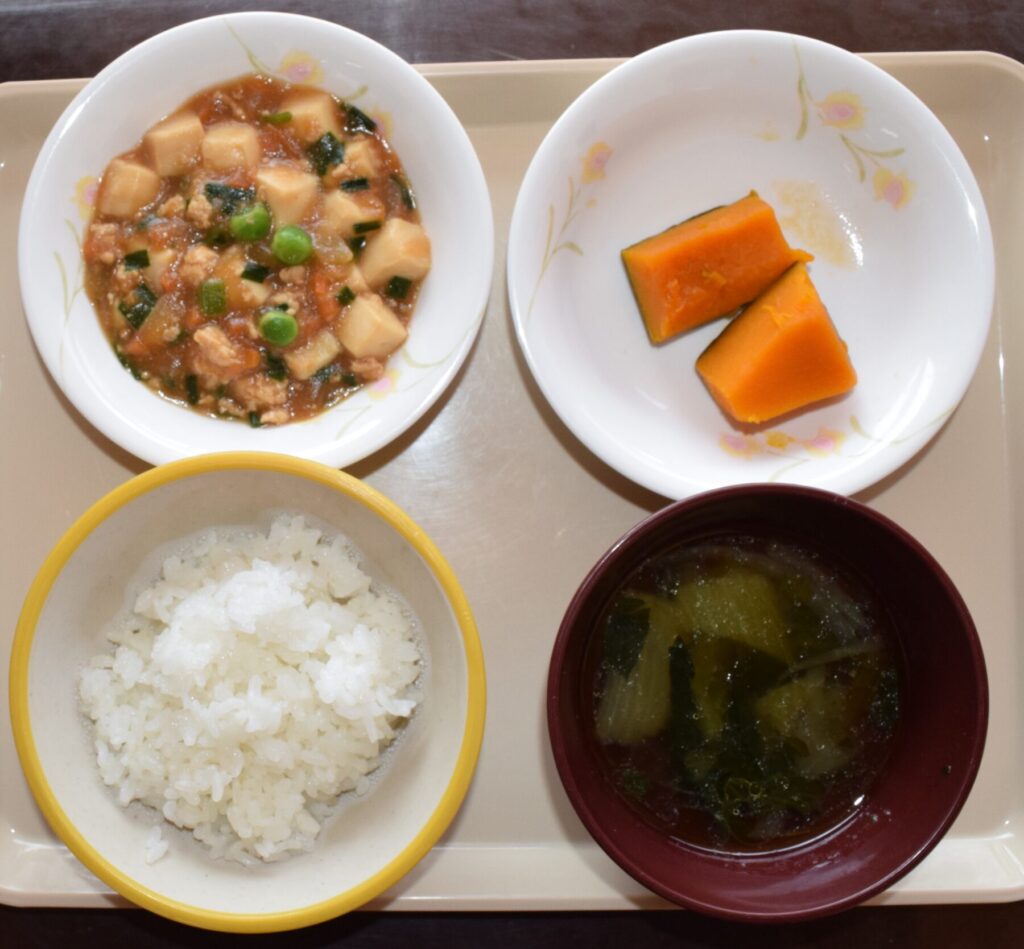 米飯・麻婆豆腐・南瓜甘煮・中華スープ