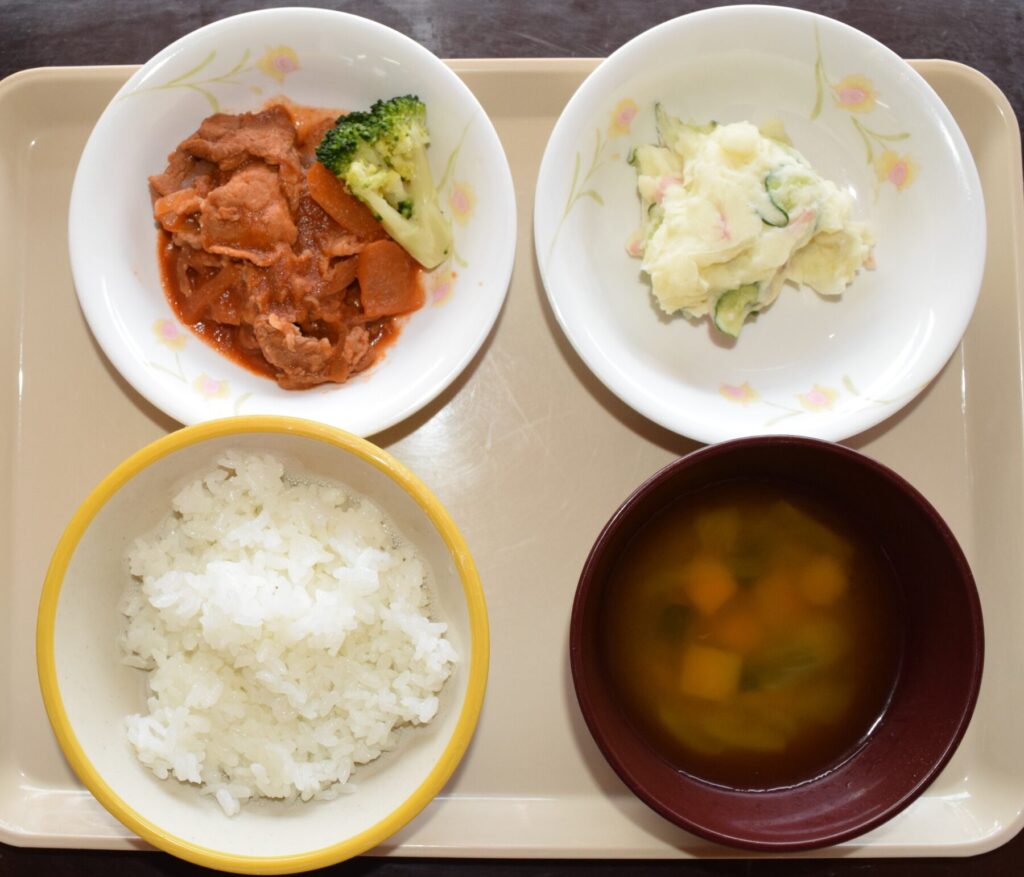 米飯・牛肉ケチャップ炒め・ポテトサラダ・コンソメスープ