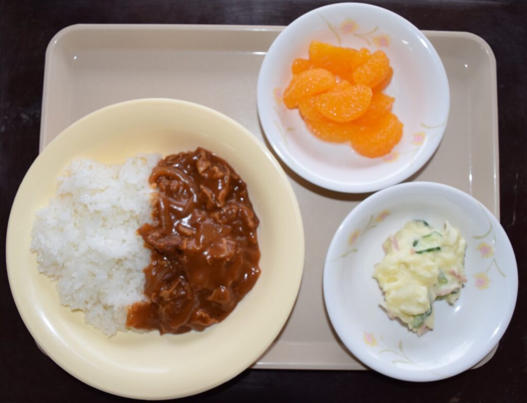 米飯・ハヤシライス・ポテトサラダ・果物缶(みかん)