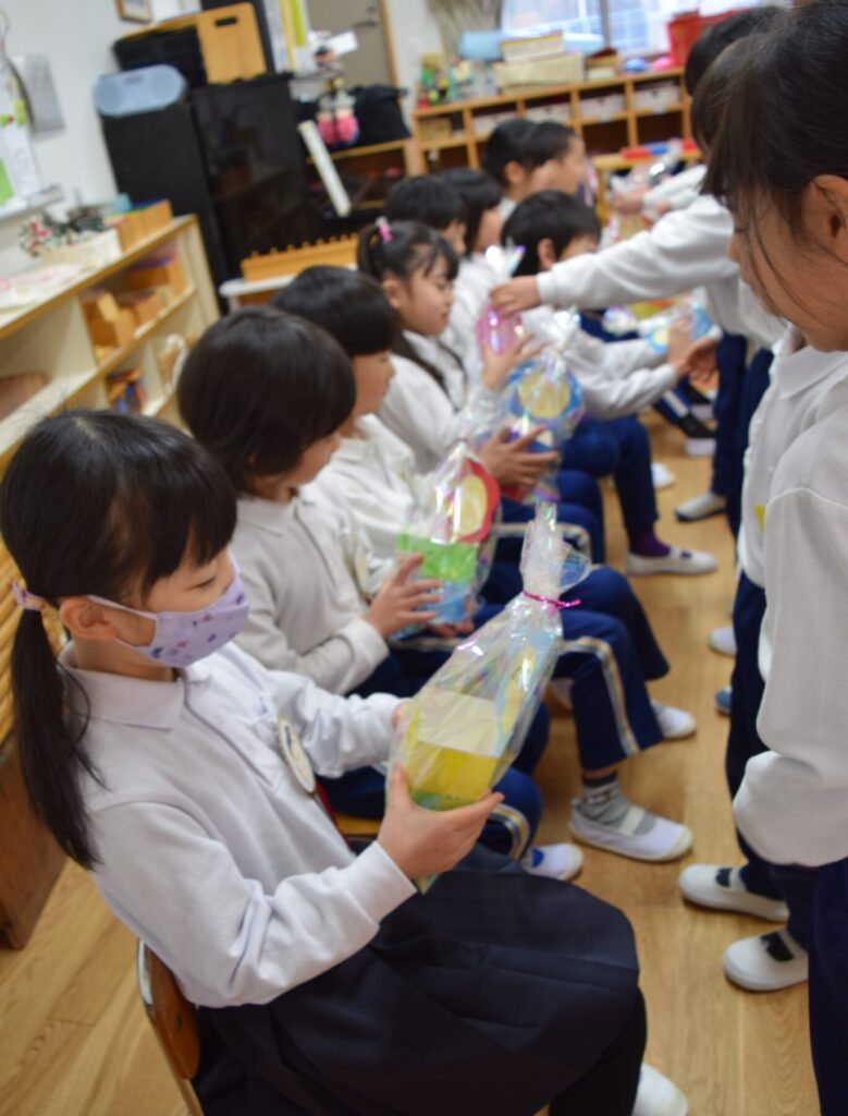 もうすぐ卒園する、年長さんとのお別れ会を行いました。お別れ会が始まる前に、年中さんと年少さんから年長さんへ、手作りの鉛筆立てとブローチのプレゼントがありました。