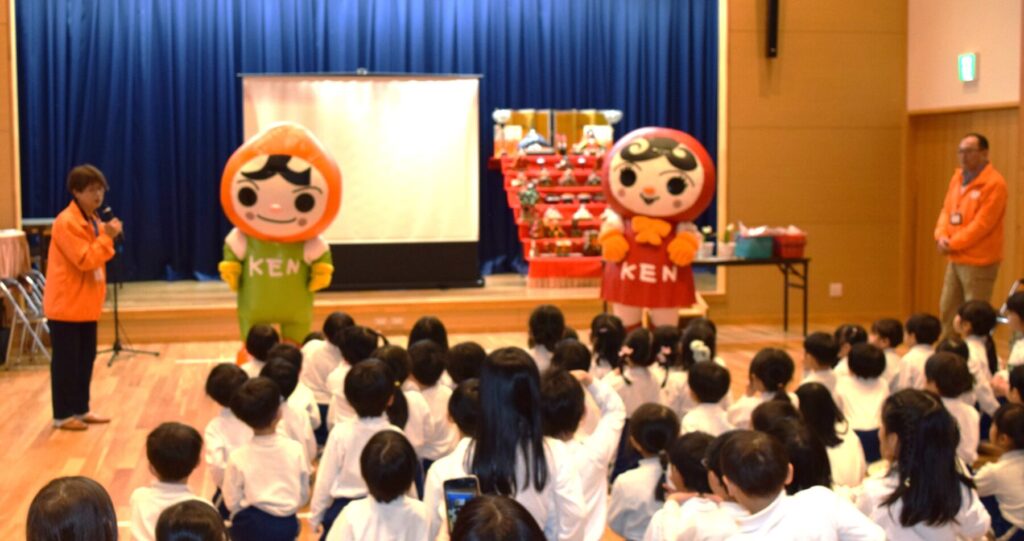 人権擁護委員の方たちに来ていただき、感謝状に贈呈式がありました。絵本の読み聞かせをしていただいた後、人権キャラクターのまもるくんとあゆみちゃんと一緒に記念写真を撮りました。